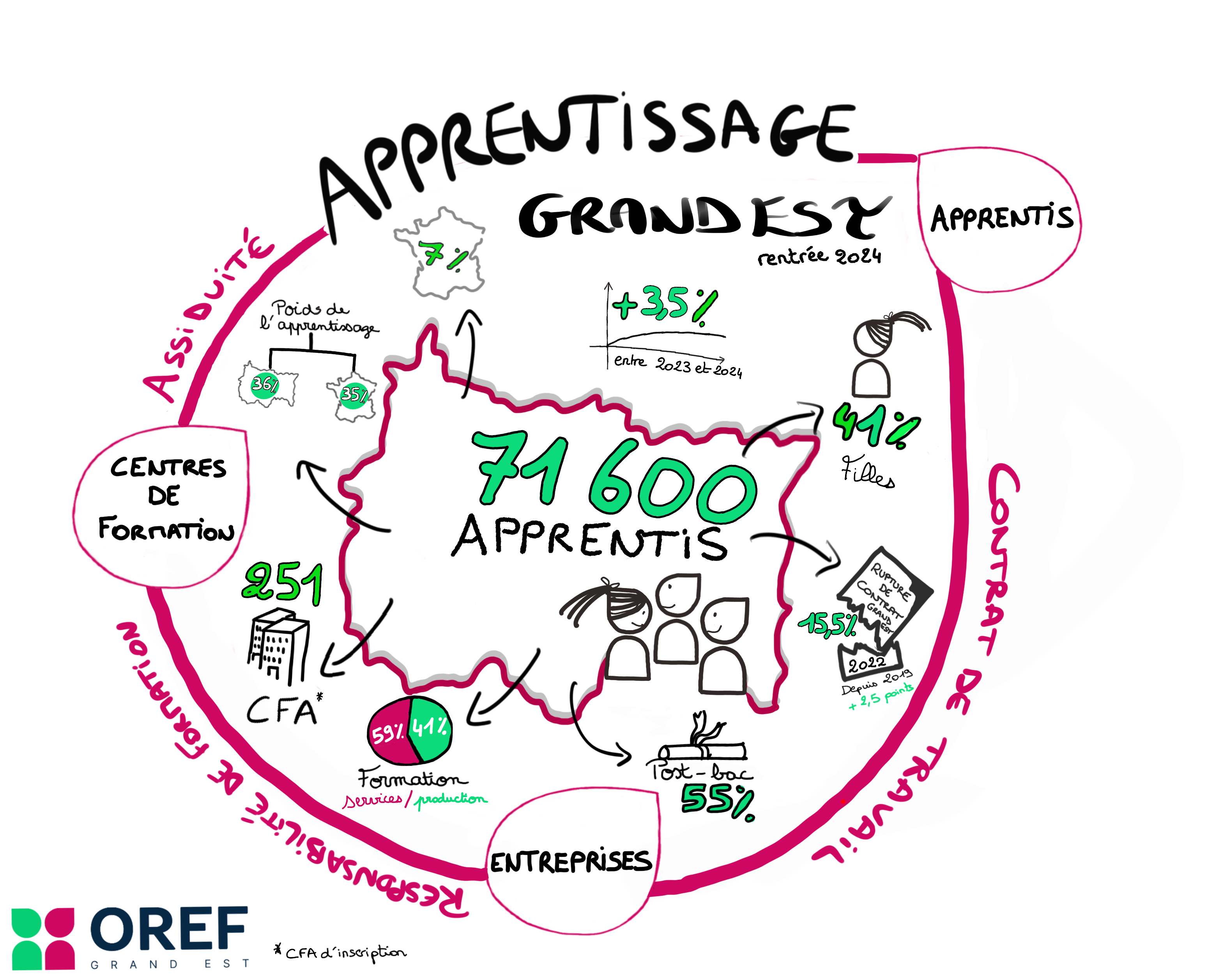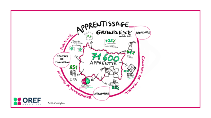 Découvrez un Sketchnote élaboré par l’Oref Grand Est, offrant une présentation visuelle et concise des données clés sur l’apprentissage. Parcourez-le pour une compréhension rapide et claire des informations principales. De plus, une nouvelle partie consacrée à la rupture de contrat d’apprentissage, a récemment été intégrée à la publication sur l’apprentissage en région Grand Est.