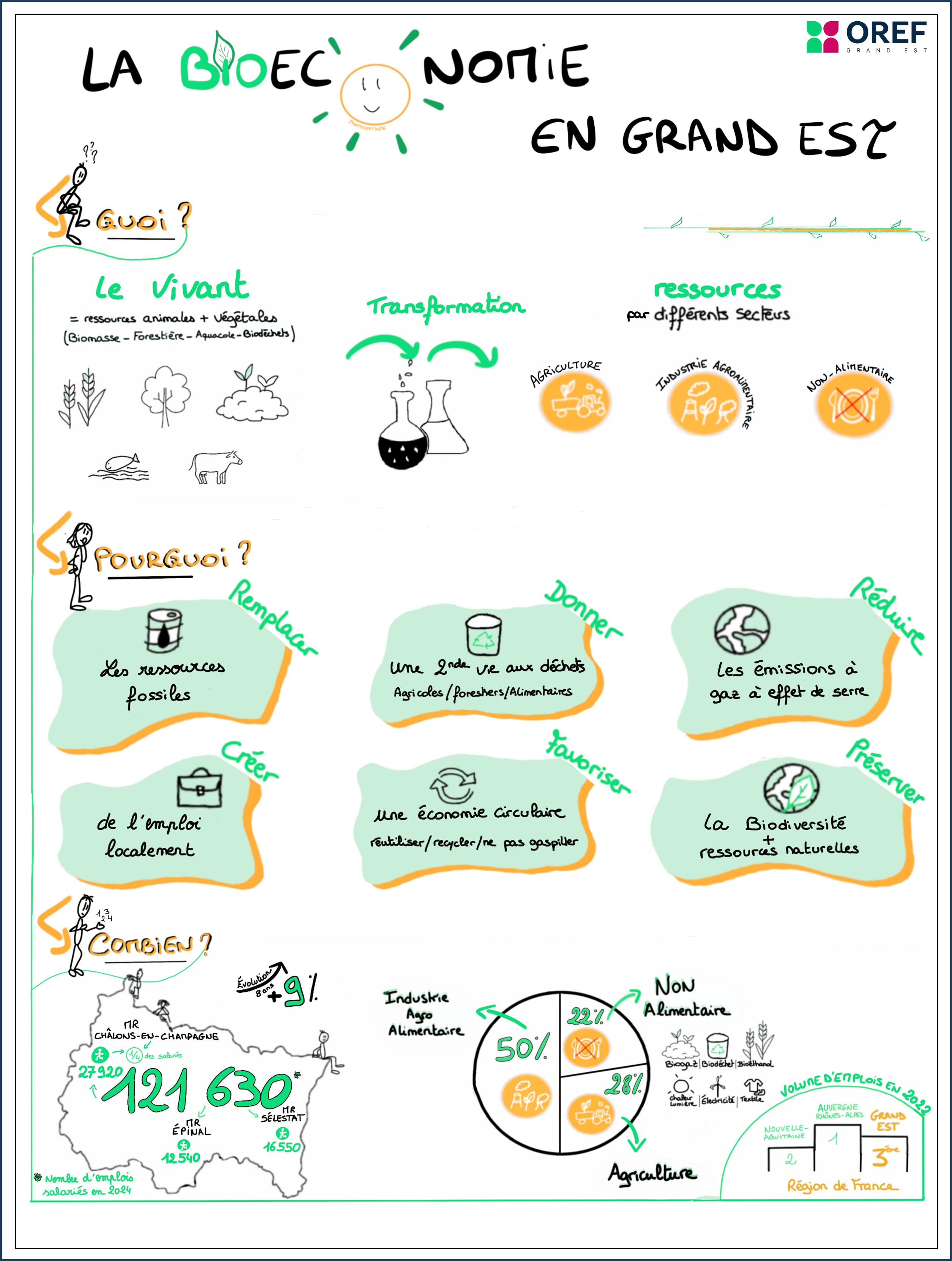 Après la publication de son étude, l’Oref vous propose un sketchnote sur la Bioéconomie. Découvrez ce visuel en 3 parties : Quoi ? Pourquoi ? Combien ? Vous comprendrez ainisi mieux la Bioéconomie, ses enjeux et son poids économique régional.