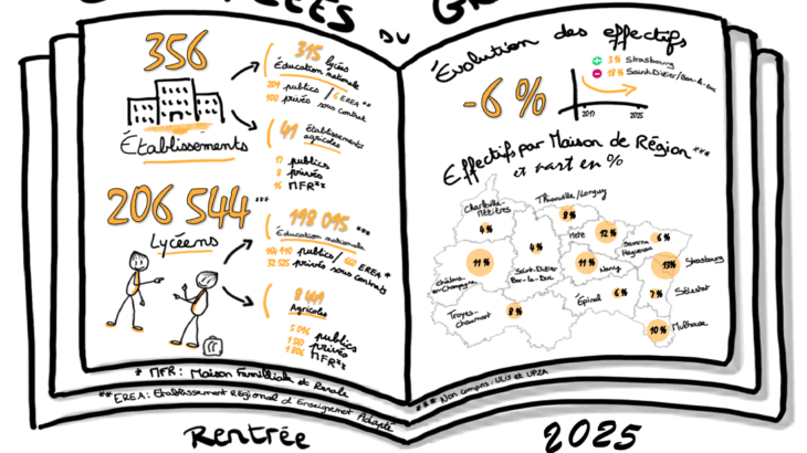 Retrouvez un sketchnote réalisé par l’Oref Grand Est présentant un état des lieux des lycées publics et privés dans la région. Découvrez les effectifs, le nombre total de lycées et l’évolution des effectifs scolaires par Maison de Région. Une ressource essentielle pour avoir une vue d’ensemble de la rentrée 2024 en Grand Est.